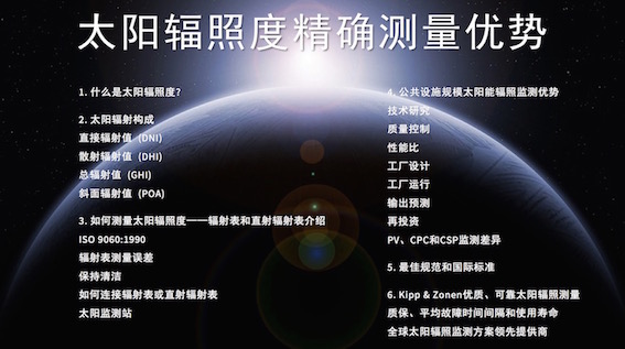 1.什么是太陽輻照度; 2.太陽輻射構成:直接輻射值(DNI)、散射輻射值(DHI)、總輻射值(GHI)、斜面輻射值(POA) 3.如何測量太陽輻照度-輻射表和直接輻射表介紹:ISO9060:1990、輻射表測量誤差、保持清潔、如何連接輻射表或直接輻射表、太陽監測站; 4?公共設施規模太陽能輻照監測優勢:技術研究、質量控制、性能比、工廠設計、工廠運行、輸出預測、再投資、PV、CPC和CSP監測差異 5?*佳規范和國際標準 6?KIPP&ZONEN優質、可靠太陽輻射測量、質保、平均故障時間間隔和使用壽命、*球太陽輻照監測方案領先提供商